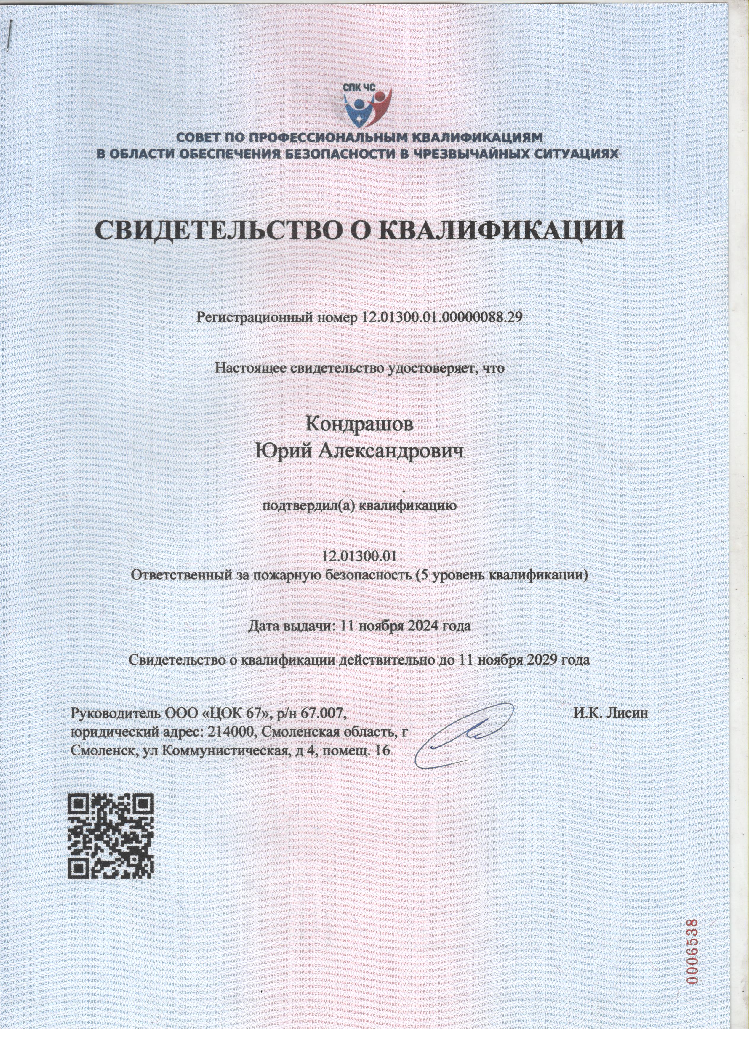 Свидетельство о квалификации "Ответственный за противопожарную безопасность" 11.11.24г.