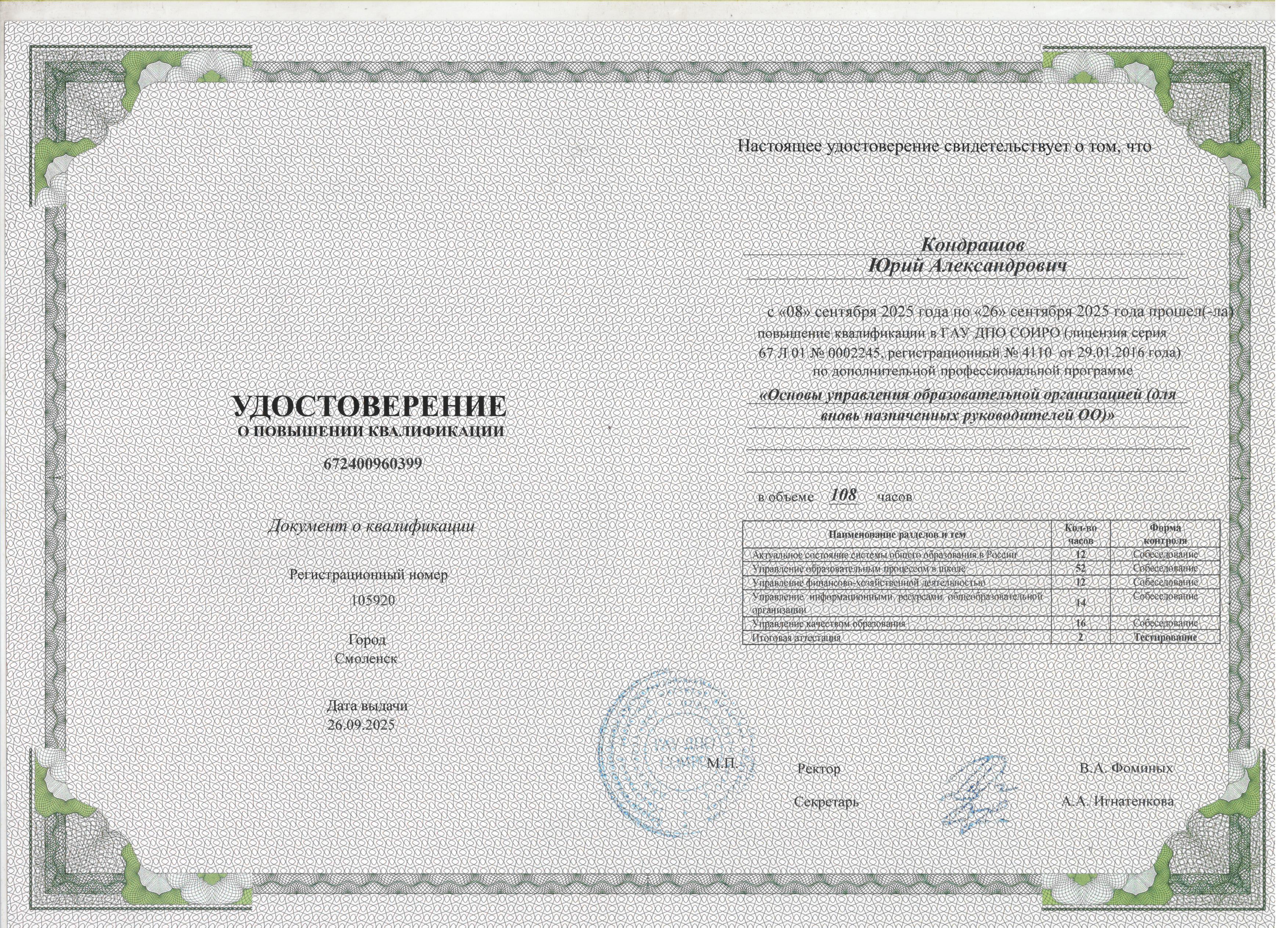 Курсы повышения квалификации в ГАУ ДПО СОИРО по дополнительной профессиональной программе "Основы управления образовательной организацией. 108 часов. 26.09.25г. № 105920